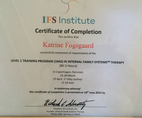 • MPF, Medlem af Dansk Psykoterapeutforening/ Member of the Danish Association for Psychotherapists. Cand.mag./MA Københavns Universitet/Copenhagen University, Board member of IFS Denmark.