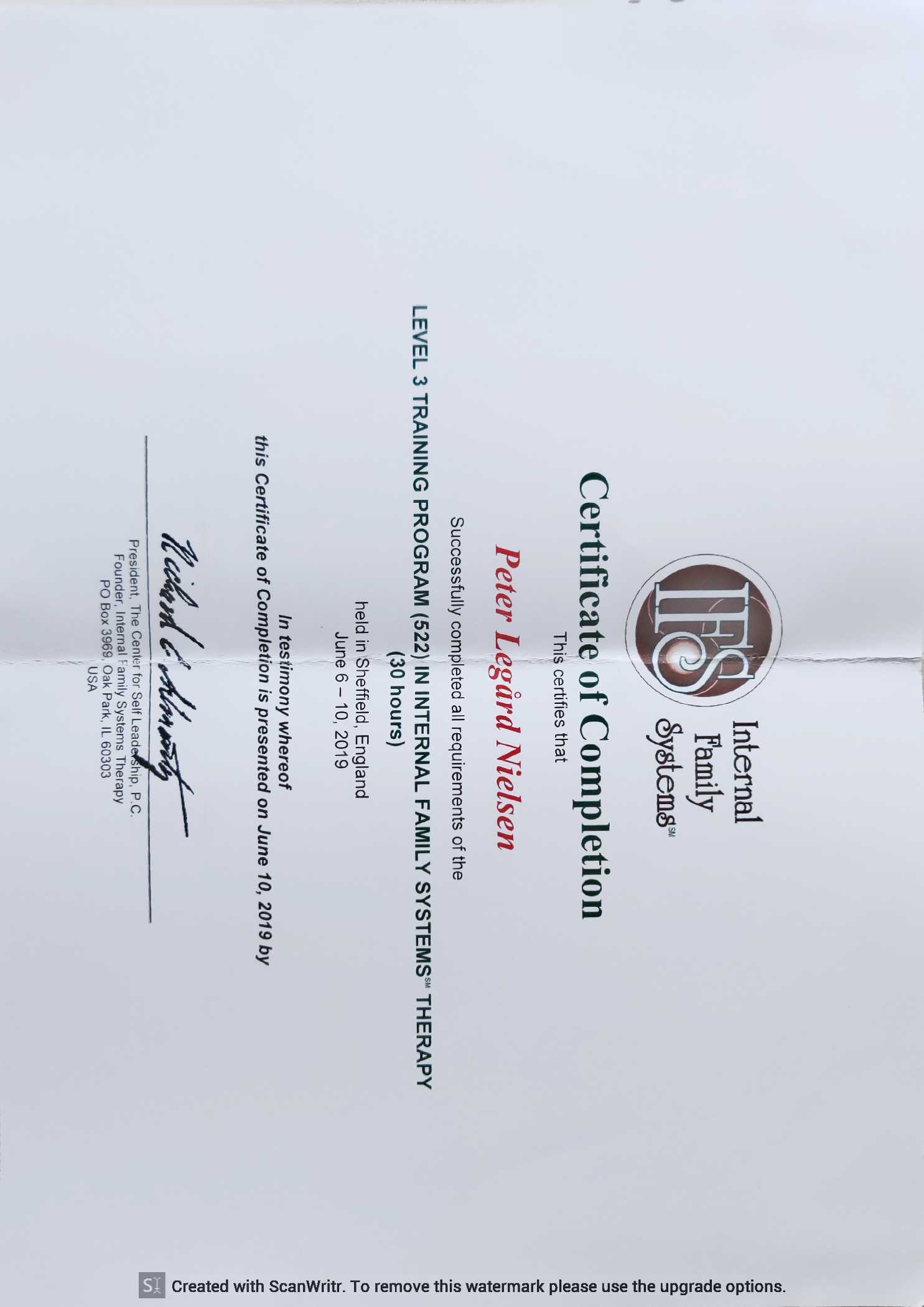 Jeg er en certificeret IFS terapeut, supervisor, og IFSI approved clinical consultant. Jeg organiserer også de officielle IFS træninger i det nordiske område fra 2024 til 2026.