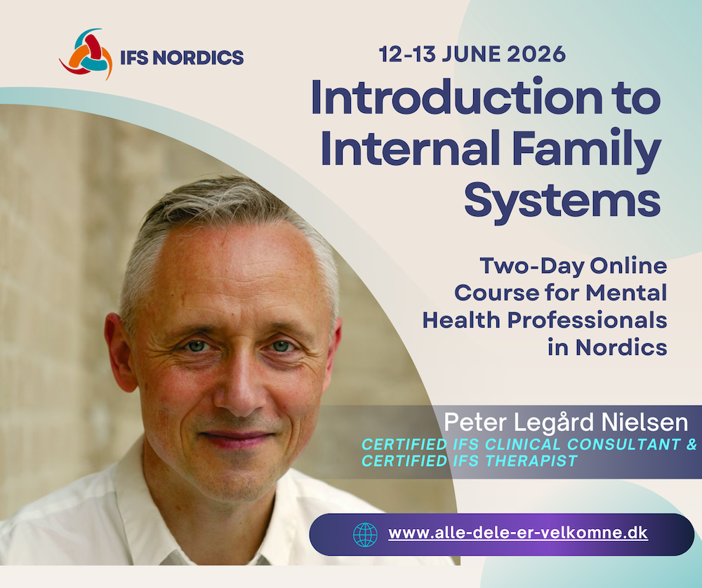 We emphasize that the workshop is an introduction to IFS and not a specific training in the model, which Peter Legård Nielsen arranges in collaboration with the IFS Institute in the USA. See more about the training here. The workshop is therefore also a good way to investigate whether the IFS training itself is something for you. NOTE! Admission to the official IFS training Level 1 requires that you are a psychologist or approved psychotherapist or similar. Read all about the criteria here.